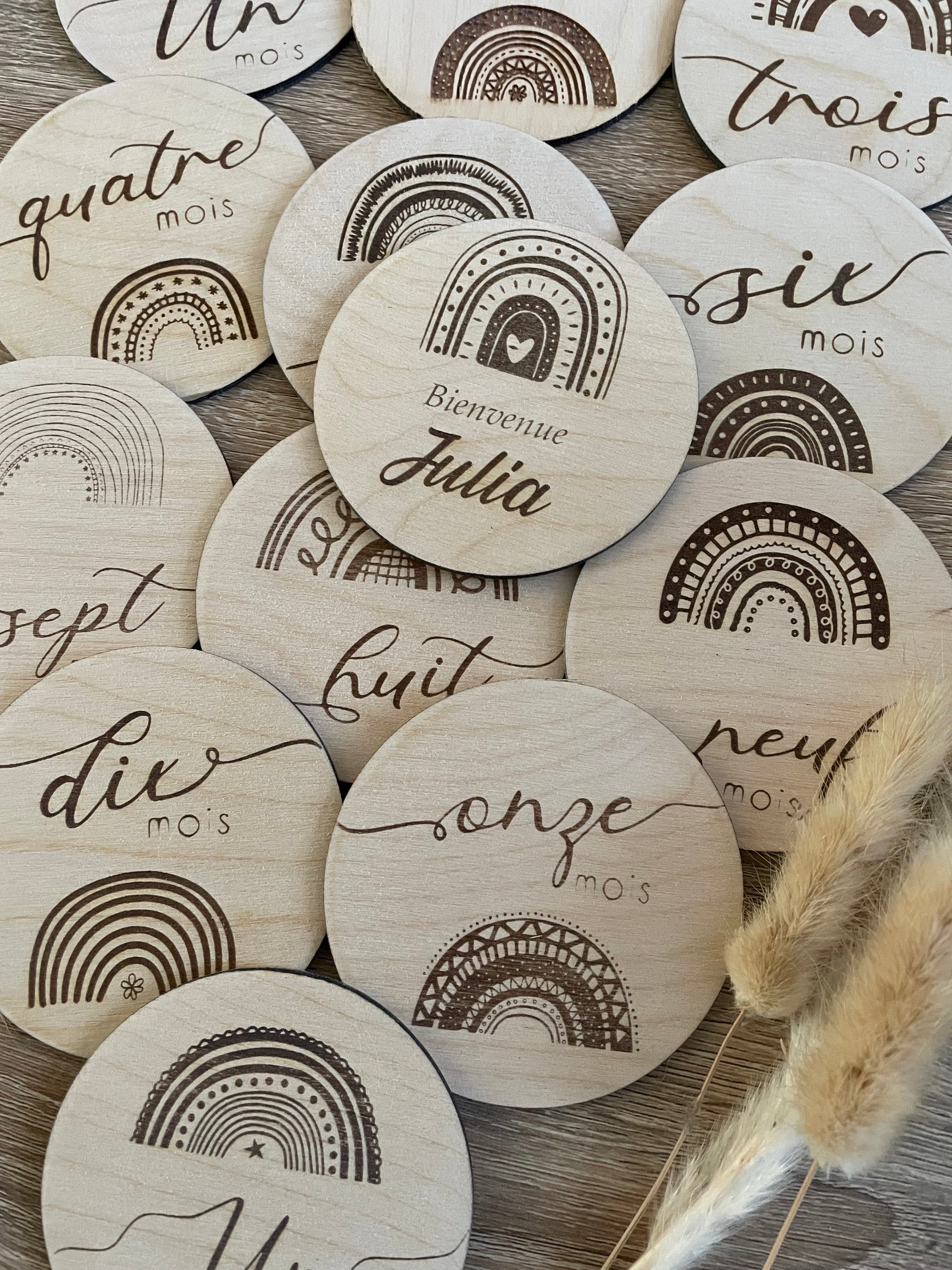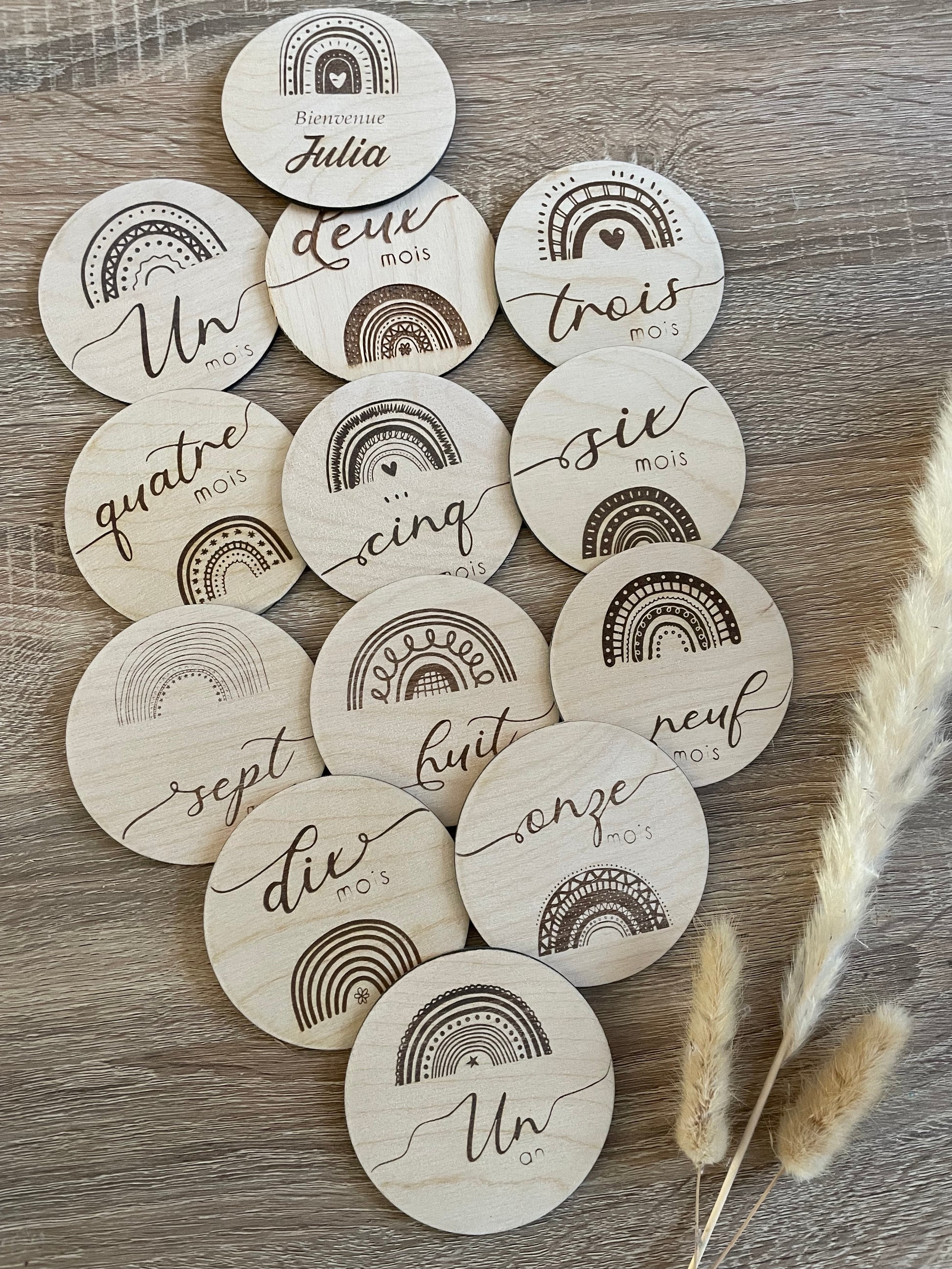 Les cartes étapes en bois pour immortaliser en photo l’évolution de bébé mois par mois durant sa première année sur le thème de l’arc en ciel 🌈