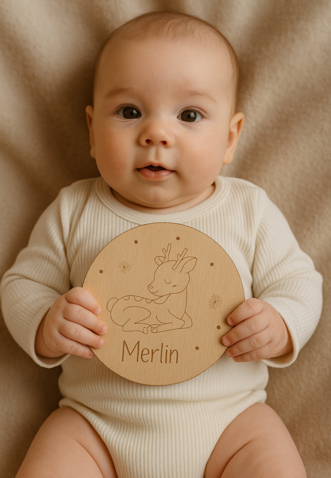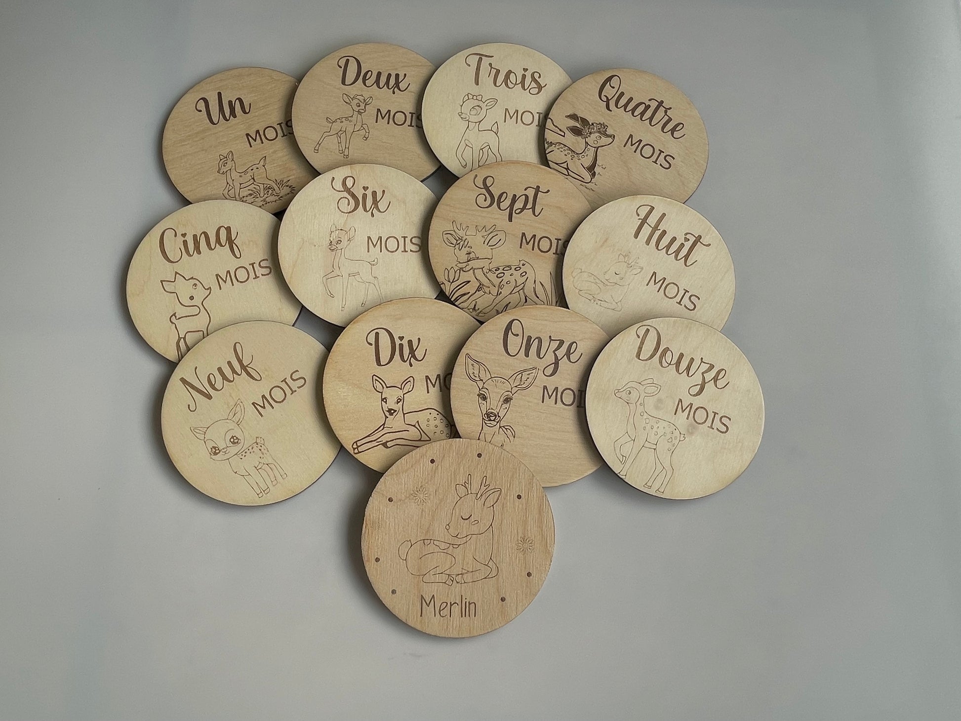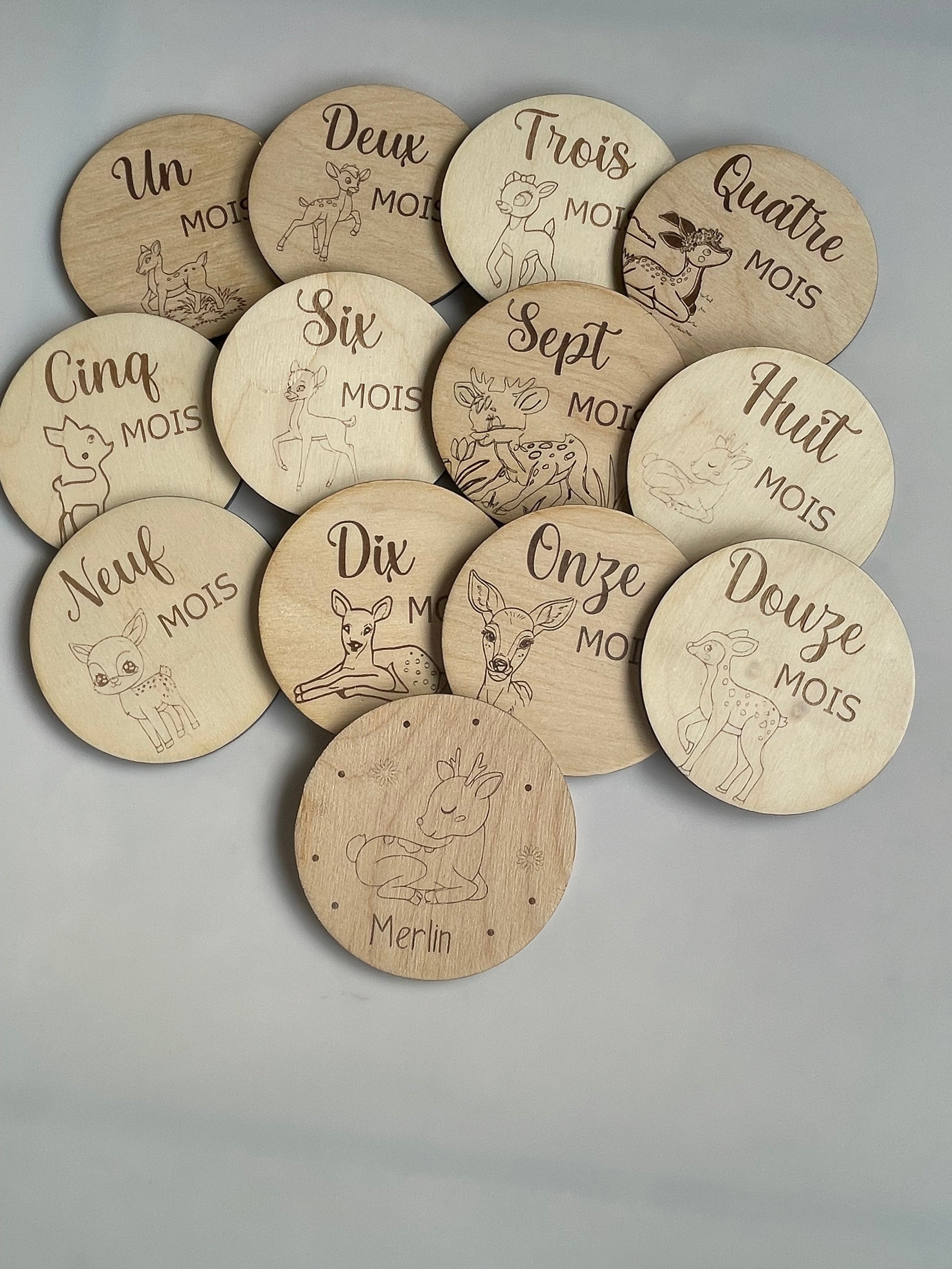 Immortalisez chaque mois de la première année de bébé avec ces adorables cartes étapes en bois gravé, illustrées d’un petit faon tout en douceur.