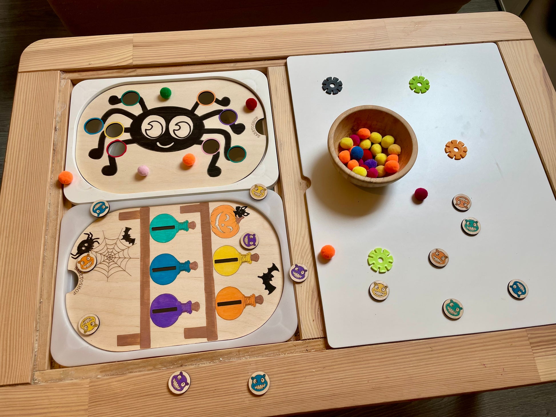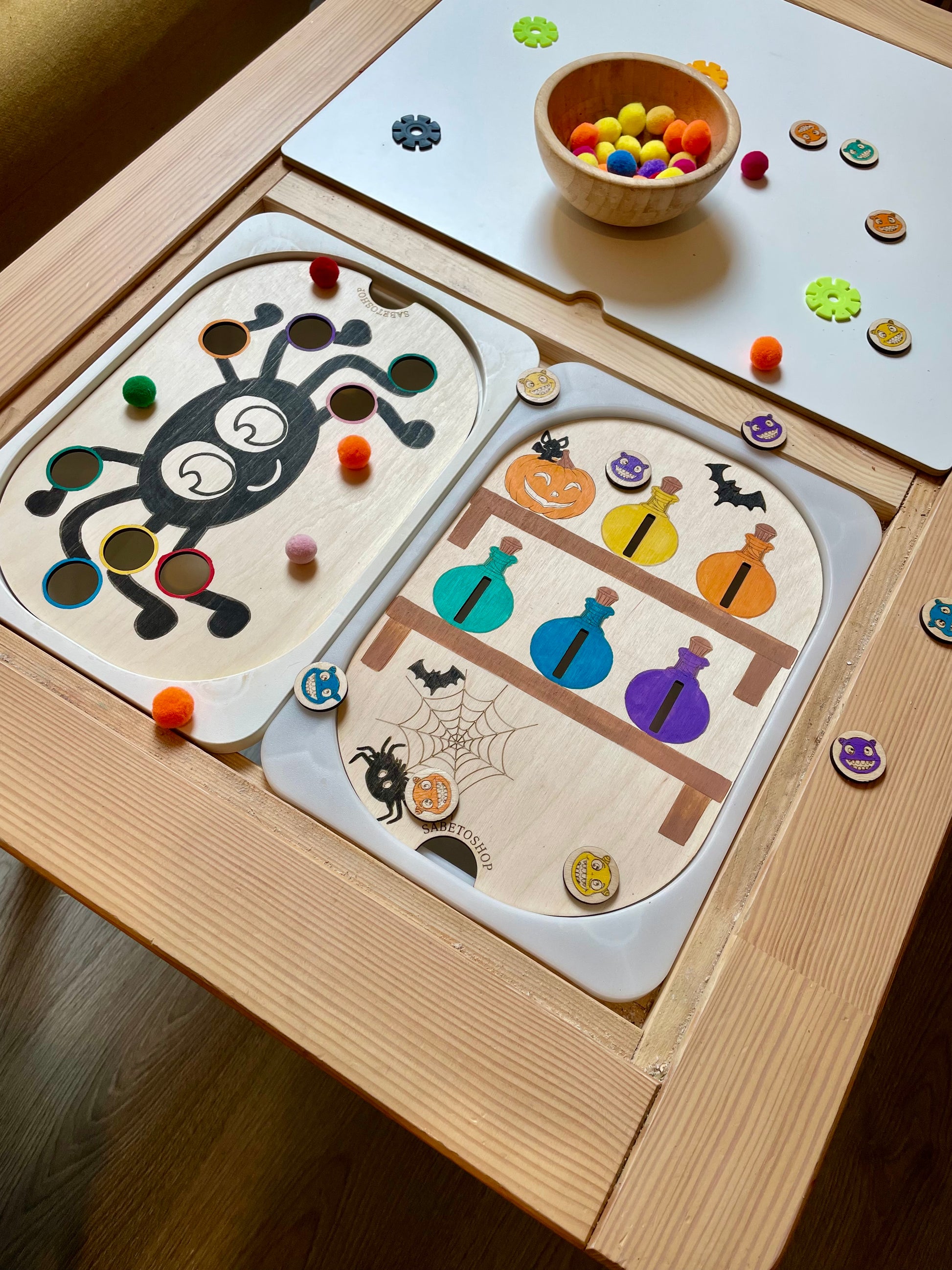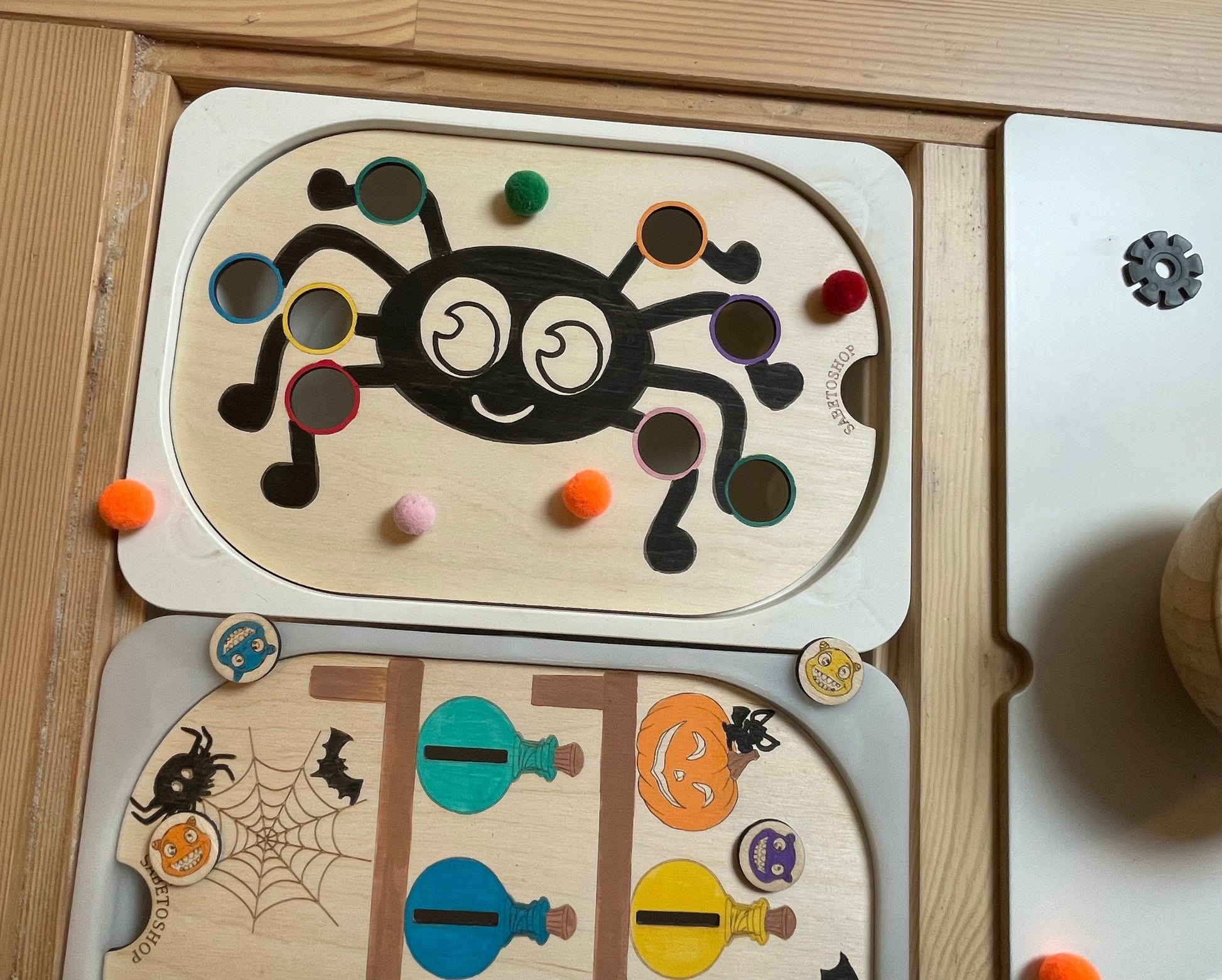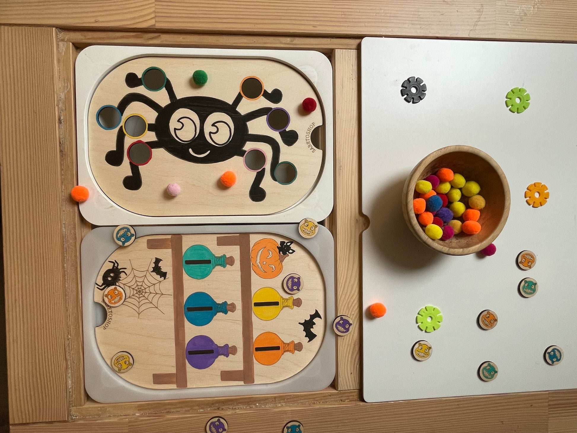 Plaque d’activité en bois adaptée au petit bac Trofast ( 30x20x10 cm ) sur le thème d’Halloween .