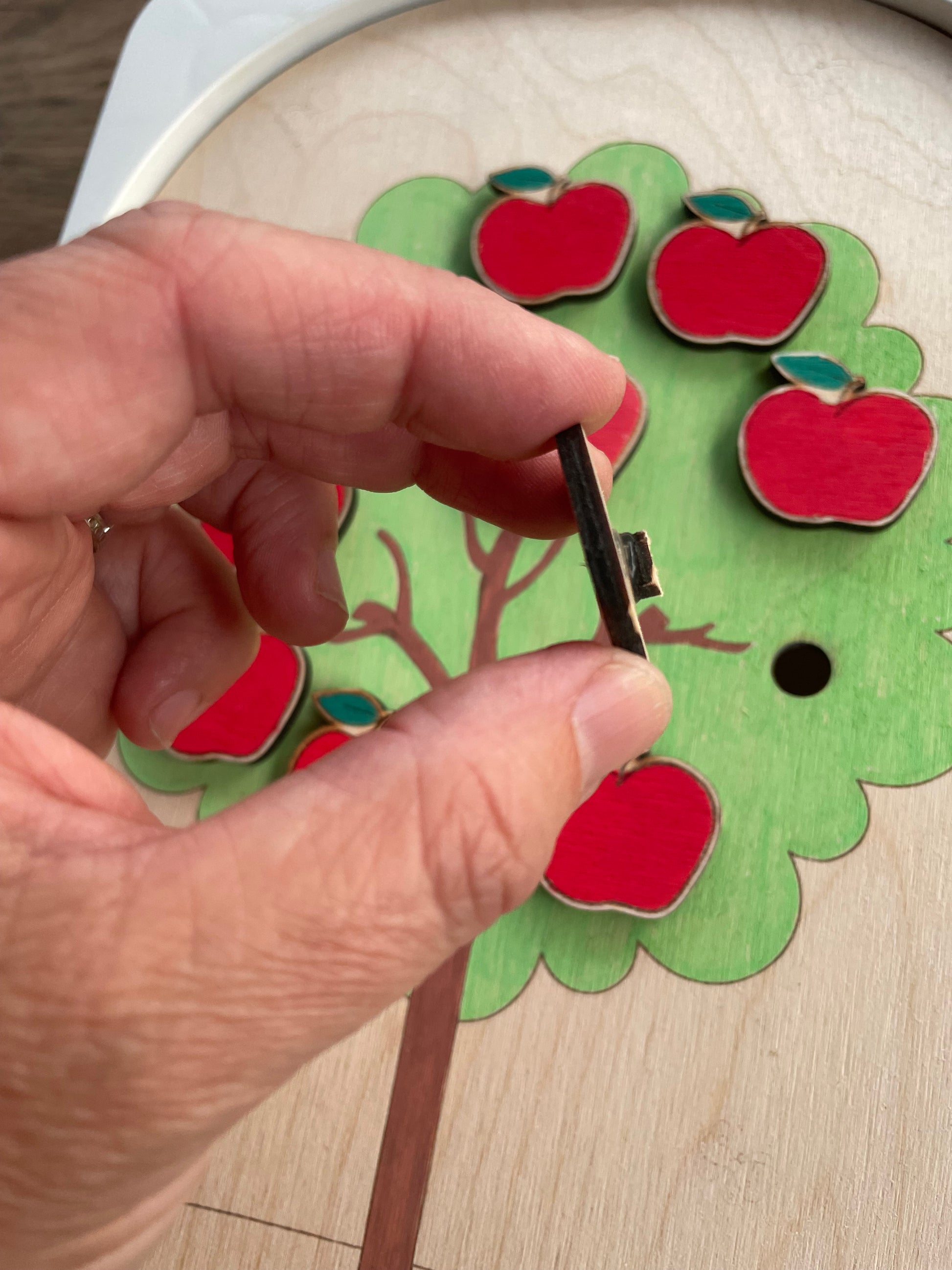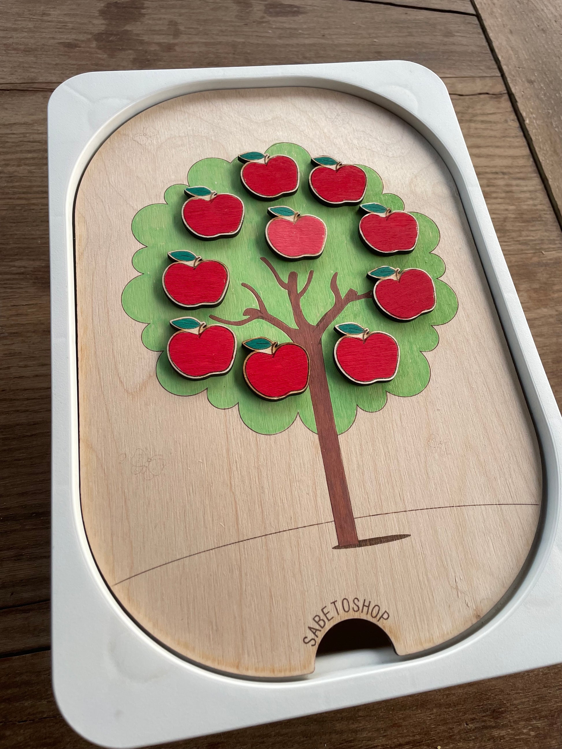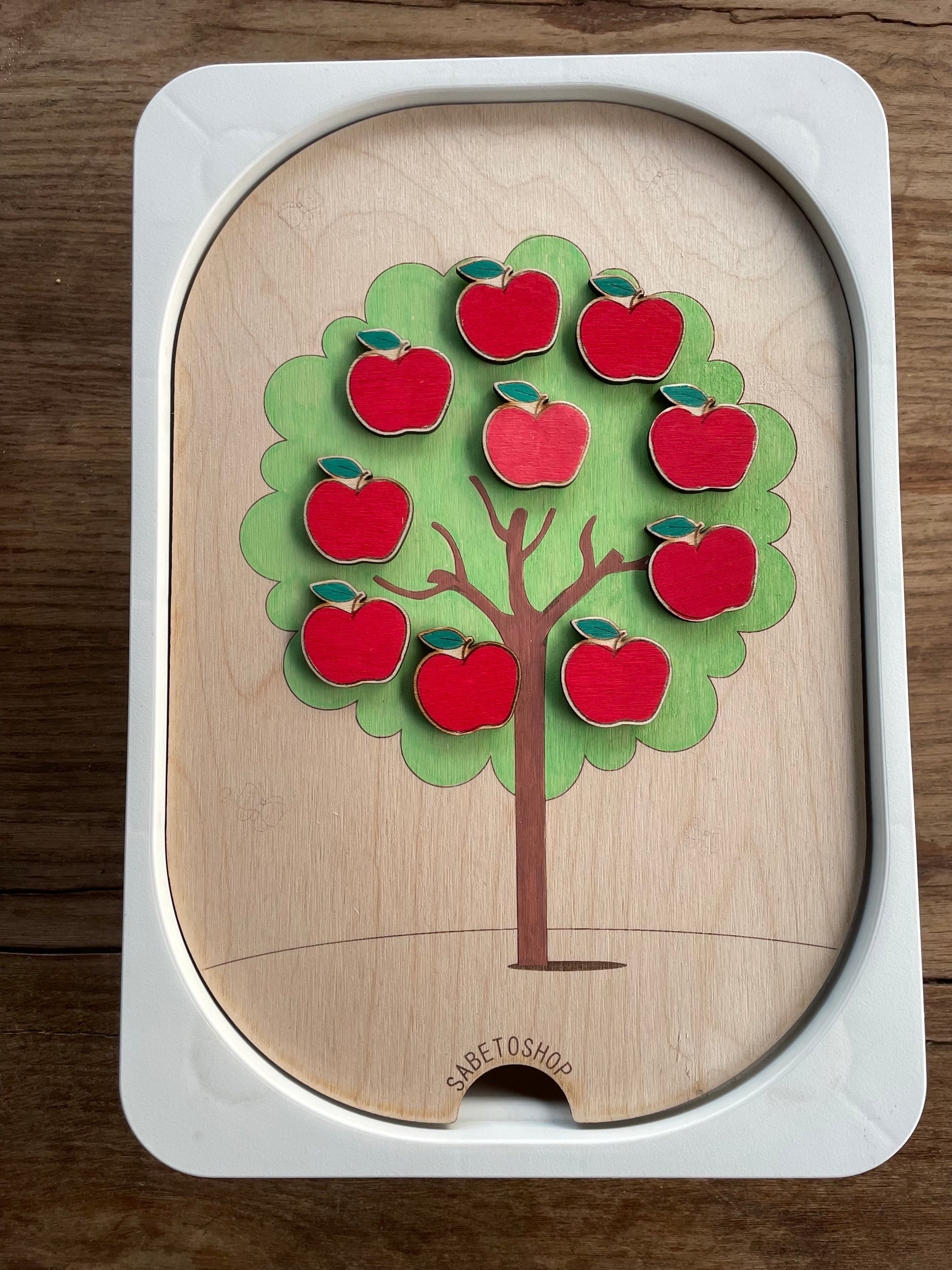 Plaquelle d’activité en bois adaptée au petit bac Trofast ( 30x20x10 cm ) sur le thème de la pomme .