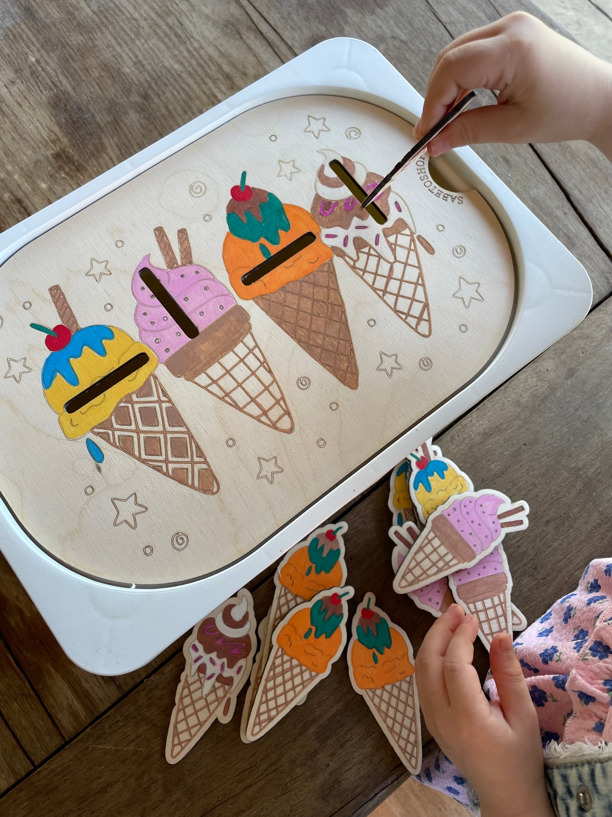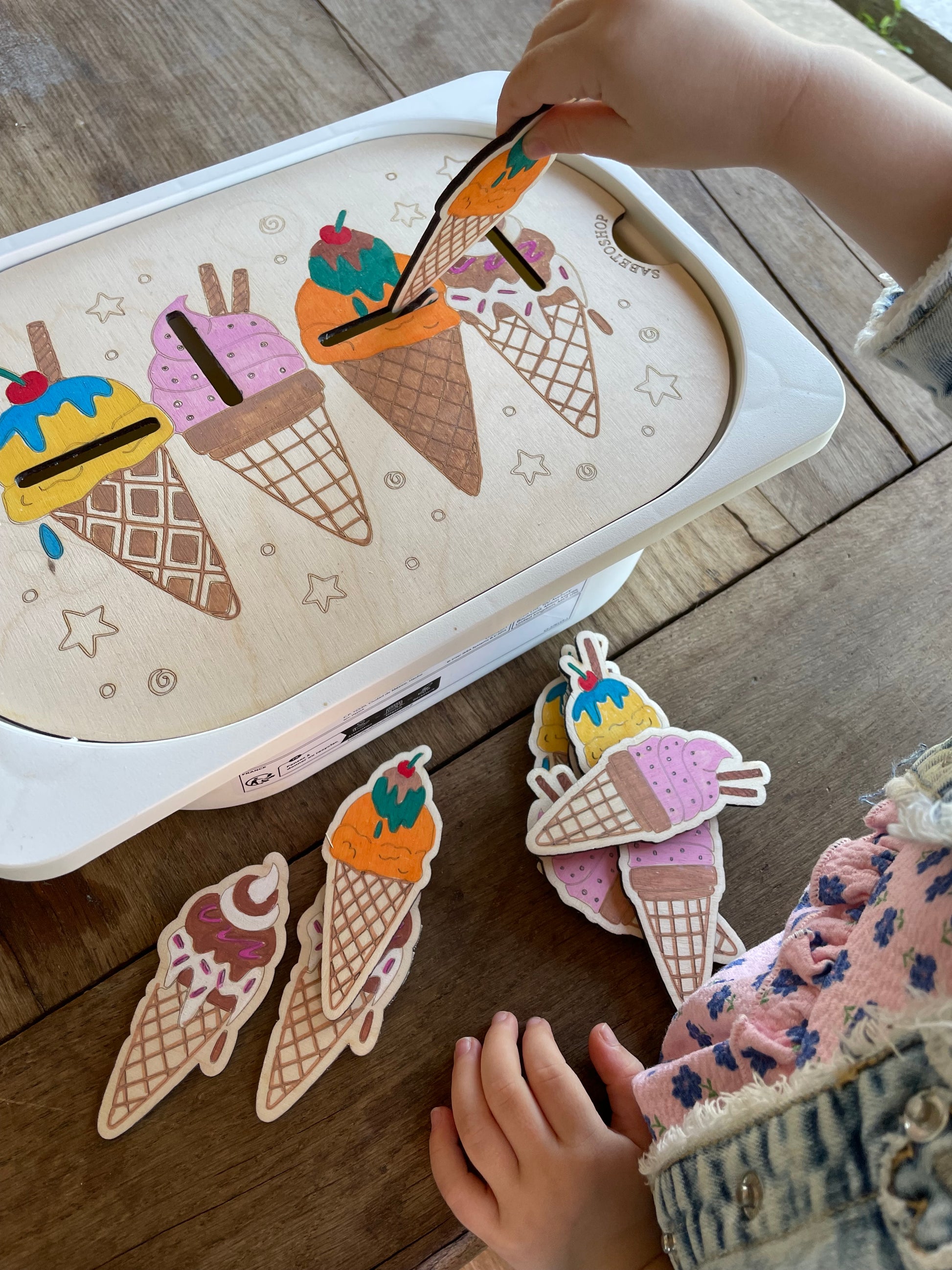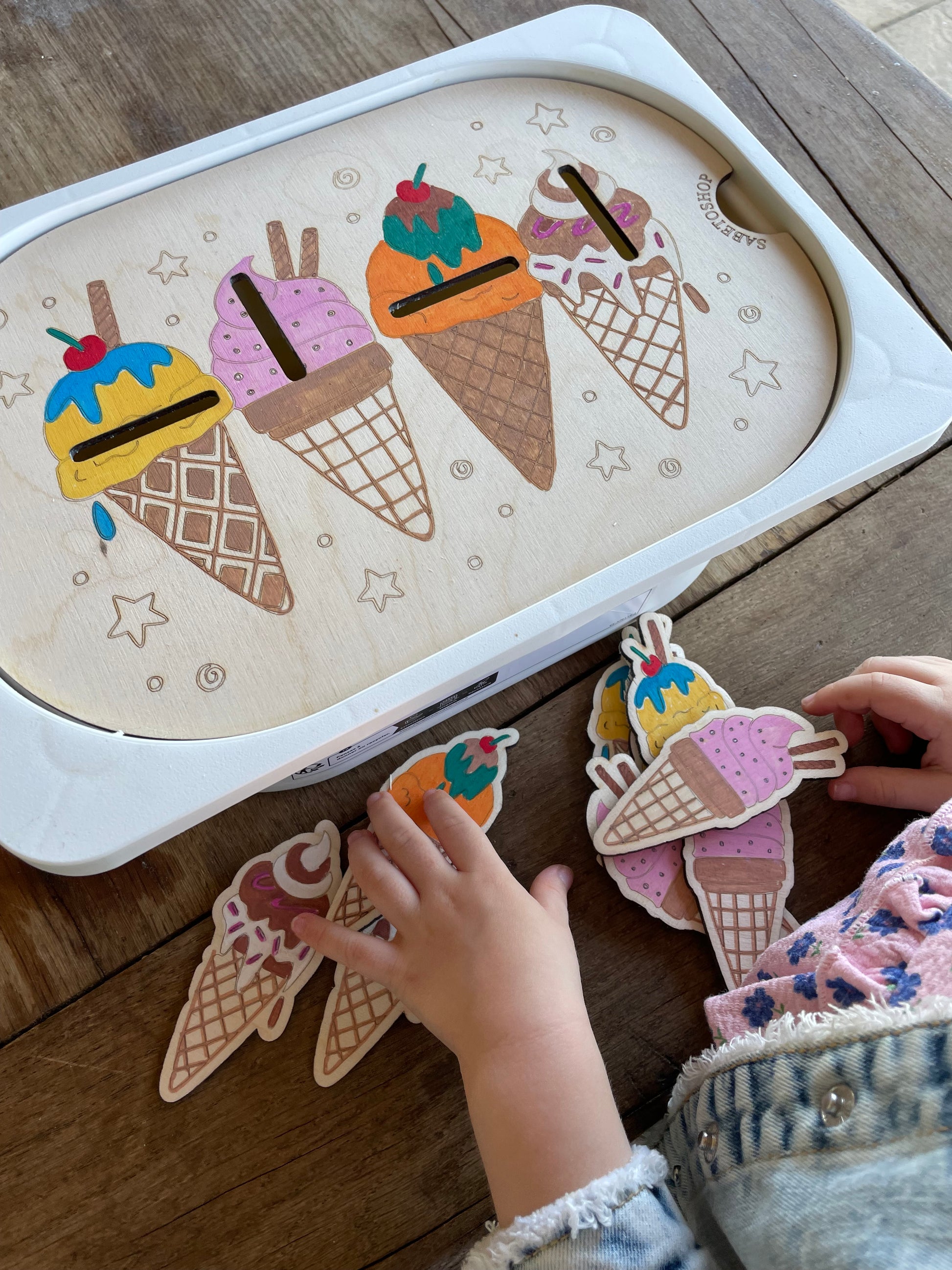 Plaque d’activité en bois adaptée au petit bac Trofast ( 30x20x10 cm ) sur le thème des cornets de glaces