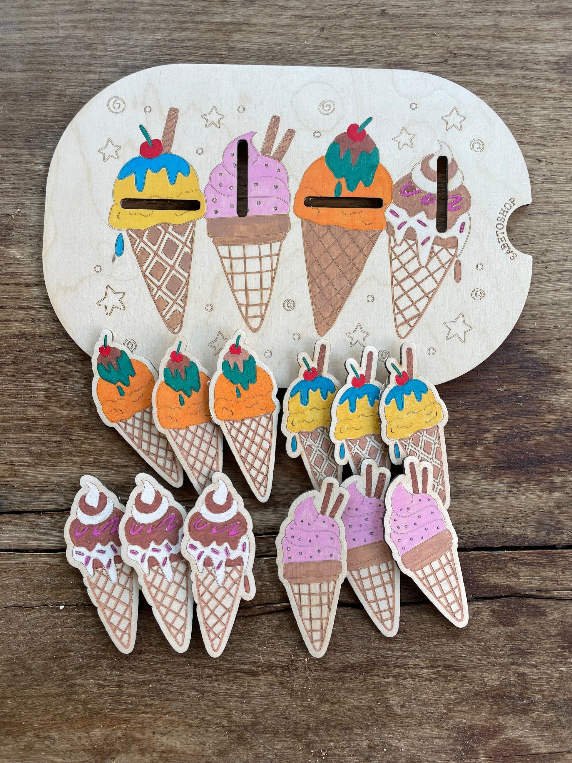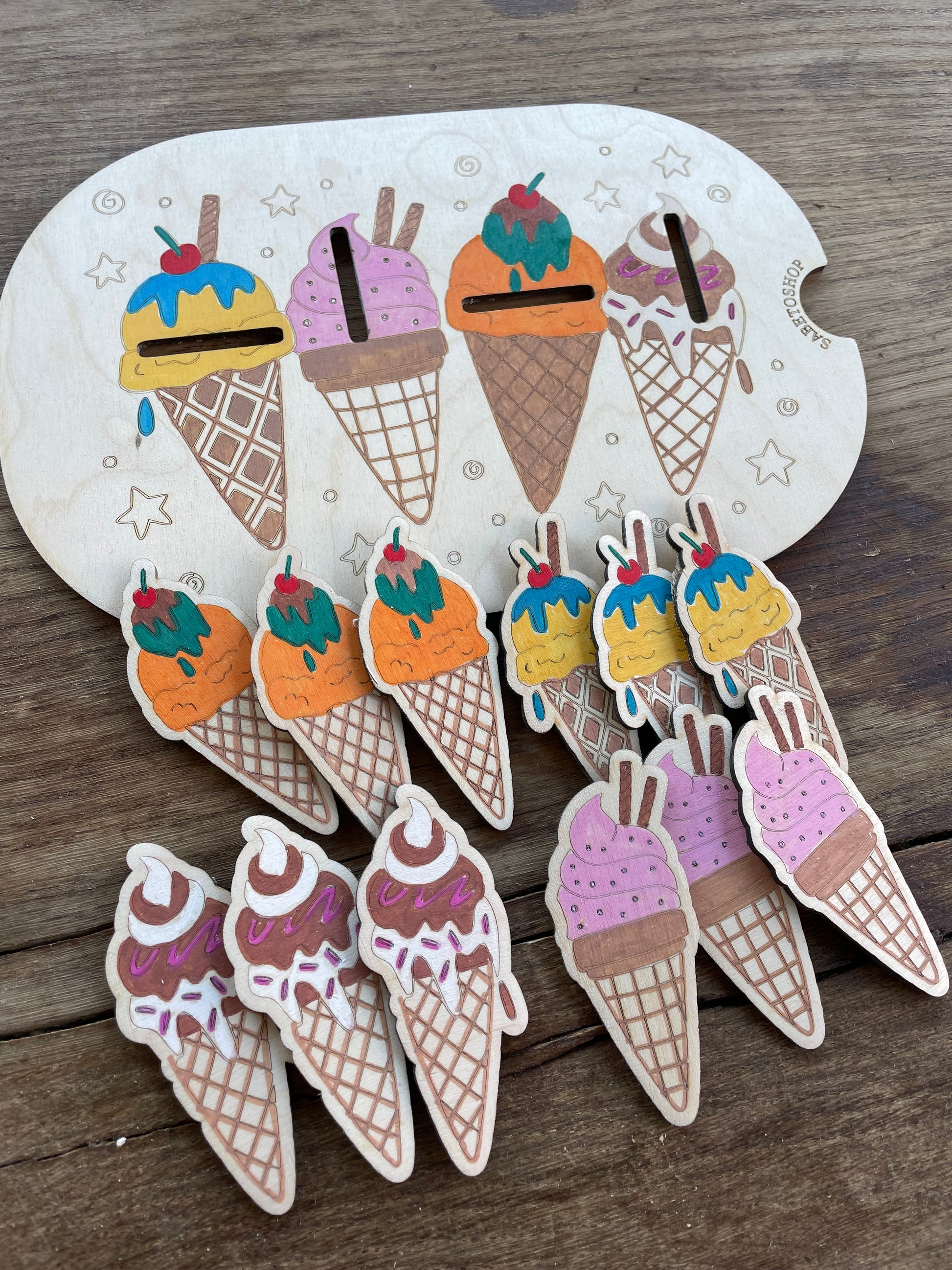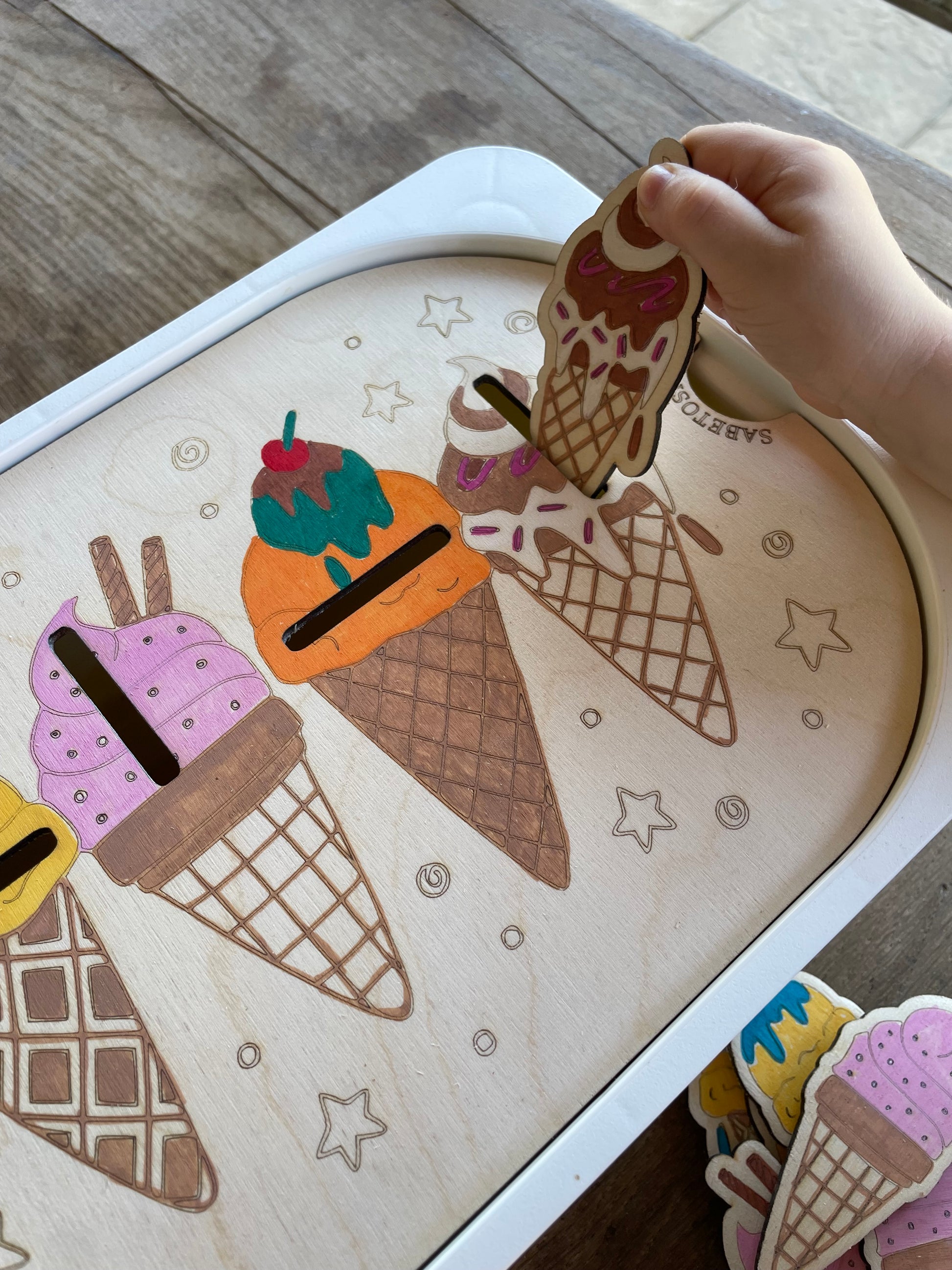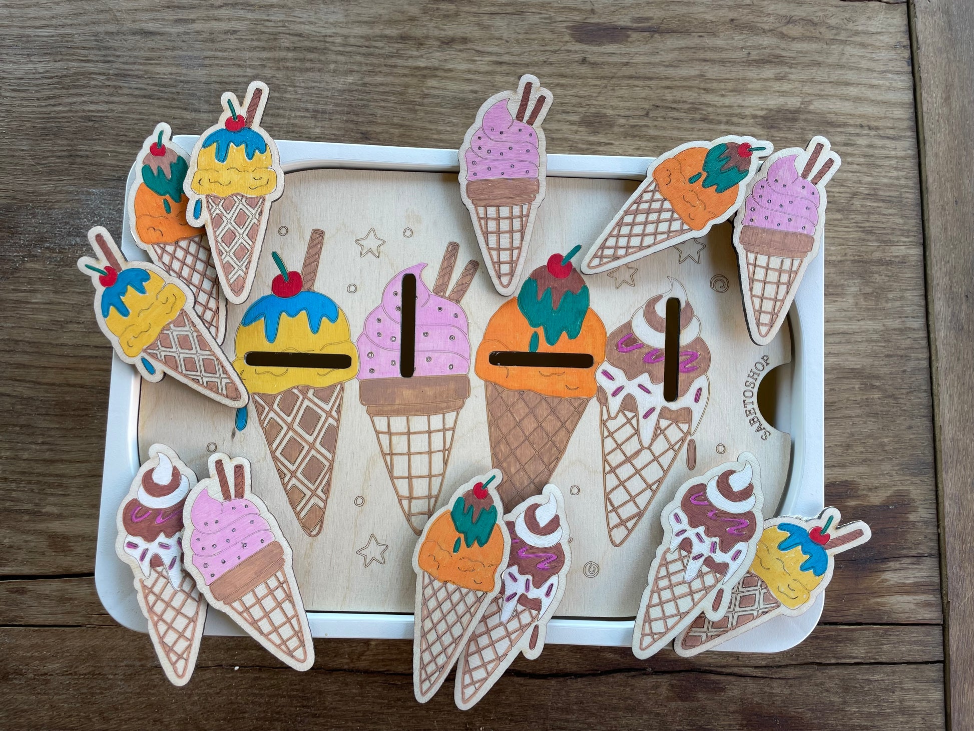 Plaque d’activité en bois adaptée au petit bac Trofast ( 30x20x10 cm ) sur le thème des cornets de glaces