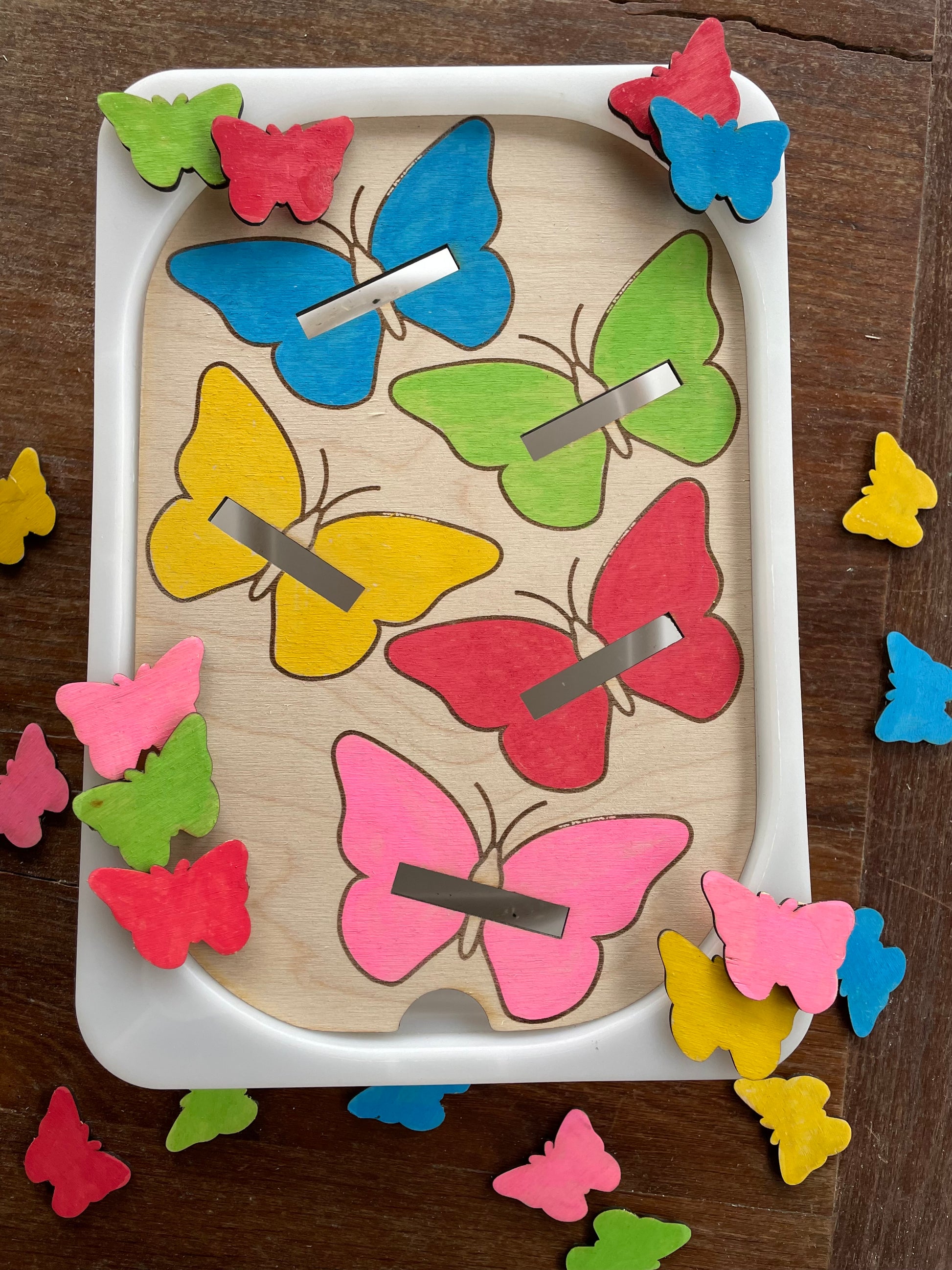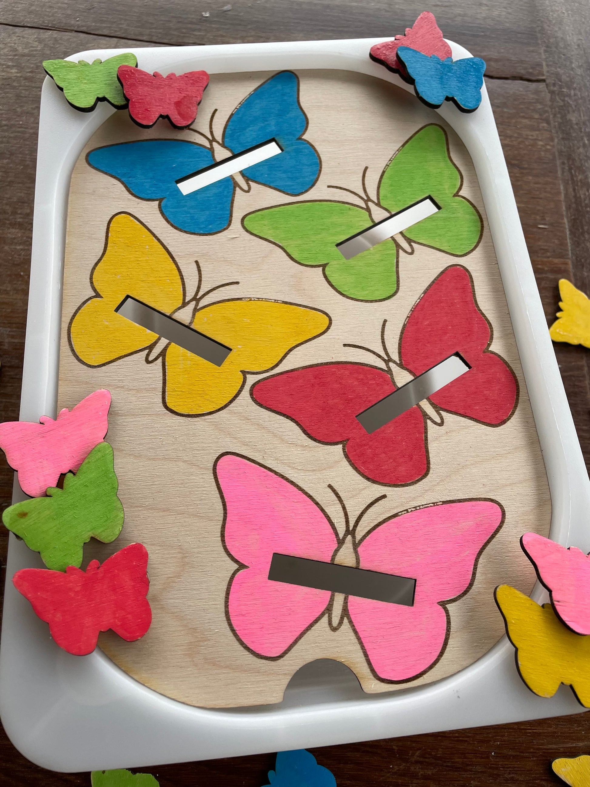 Plaque d’activité en bois adaptée au petit bac Trofast ( 30x20x10 cm ) sur le thème des papillons.