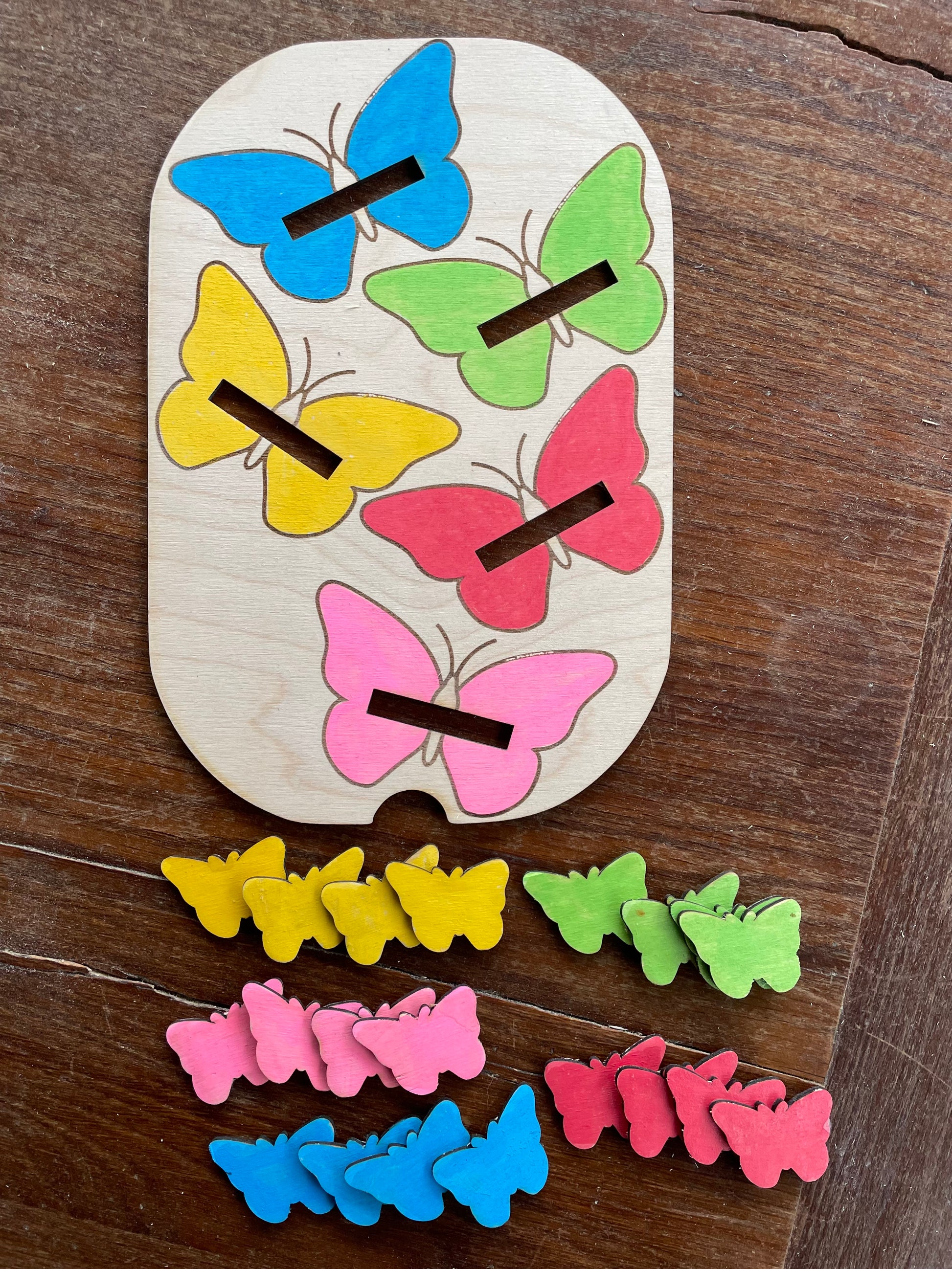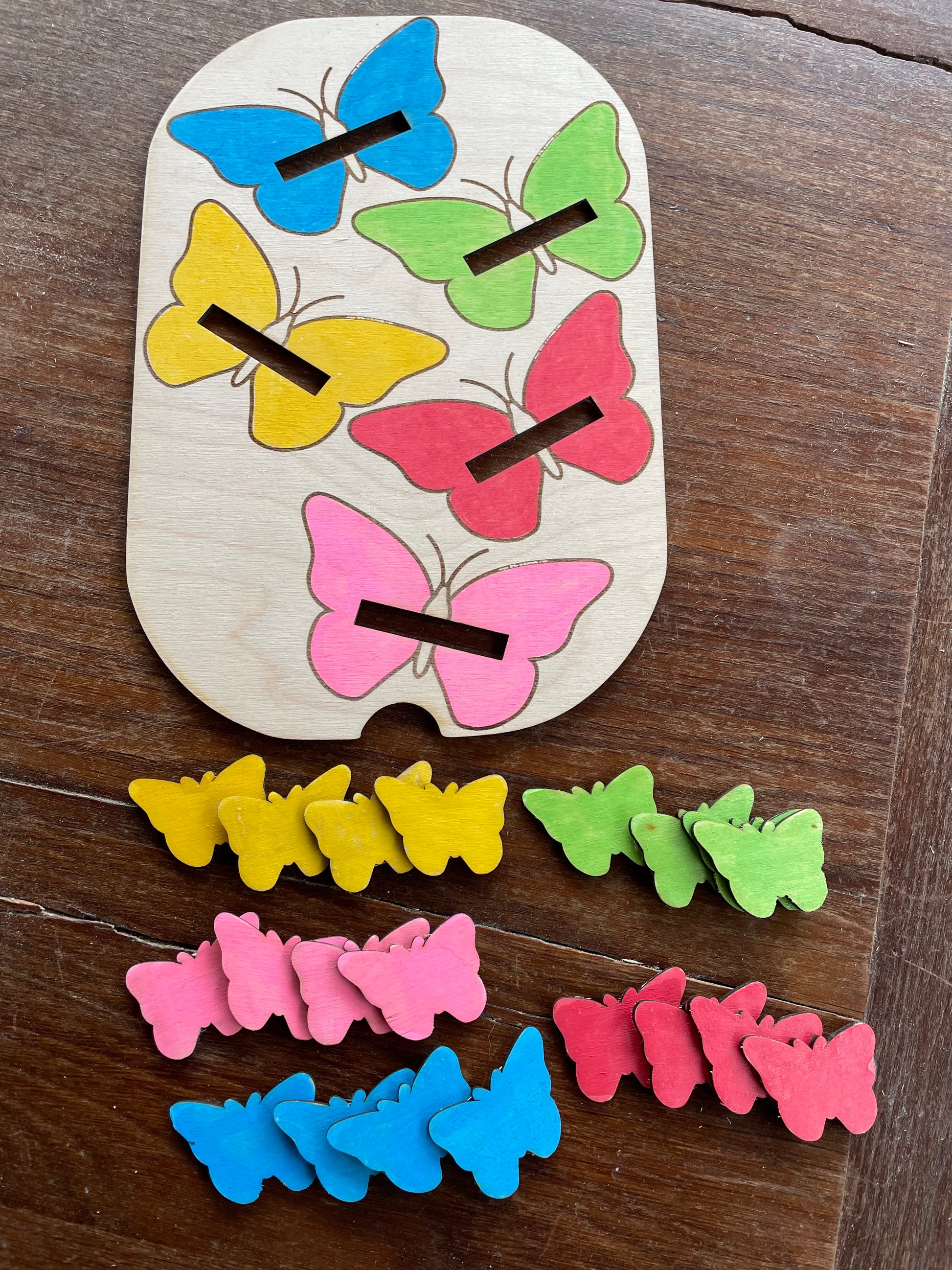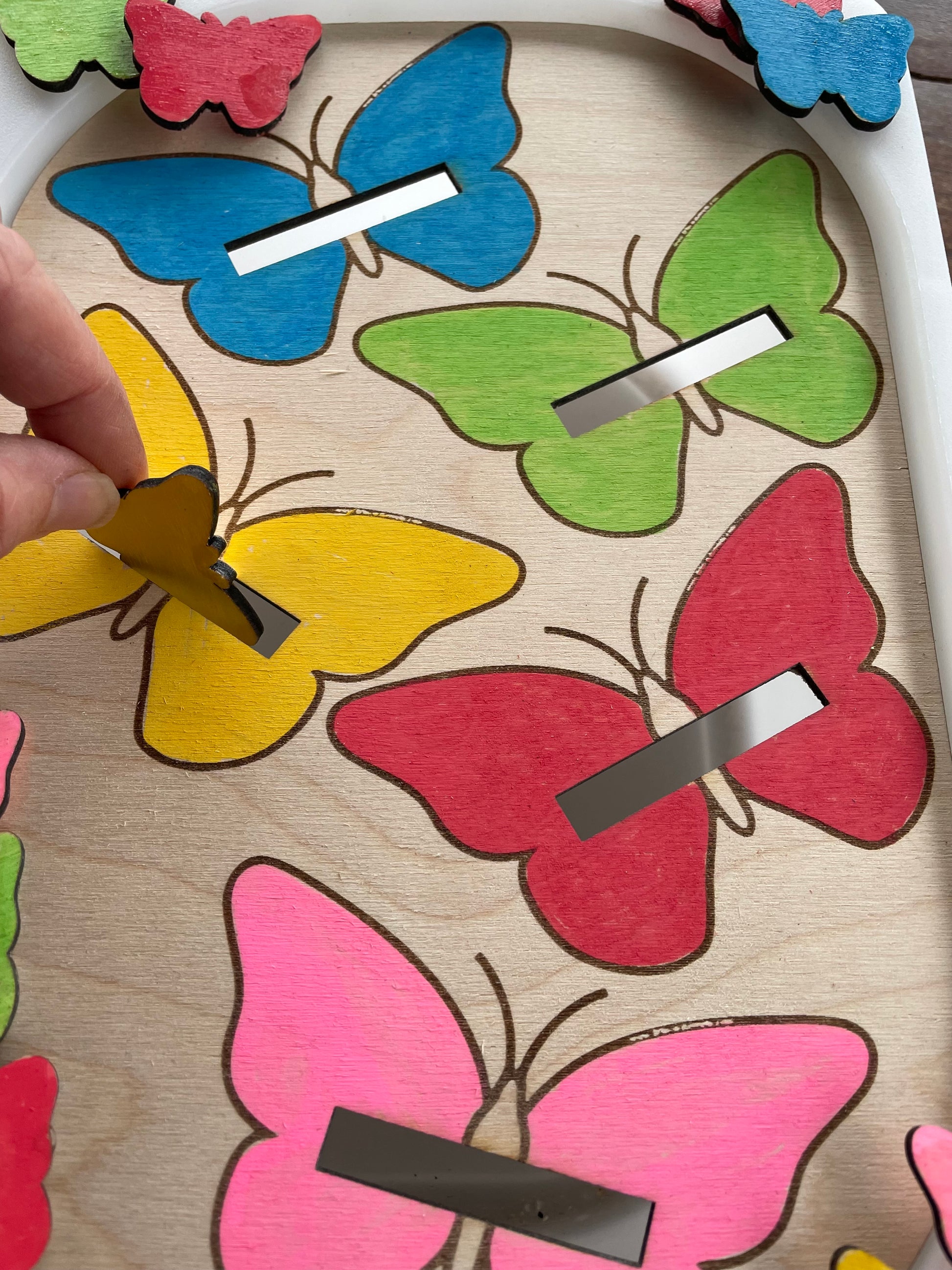 les inserts papillons en bois vernis norme jouet sont fournis avec cette plaque .