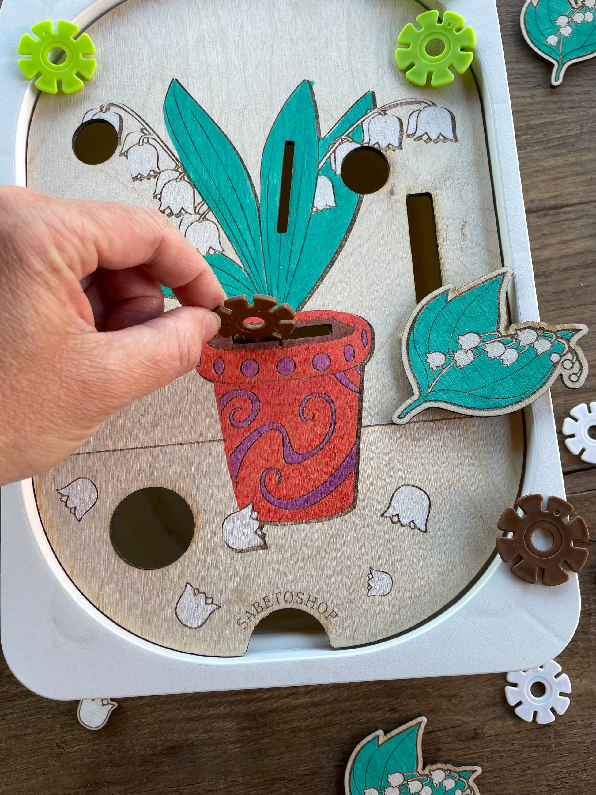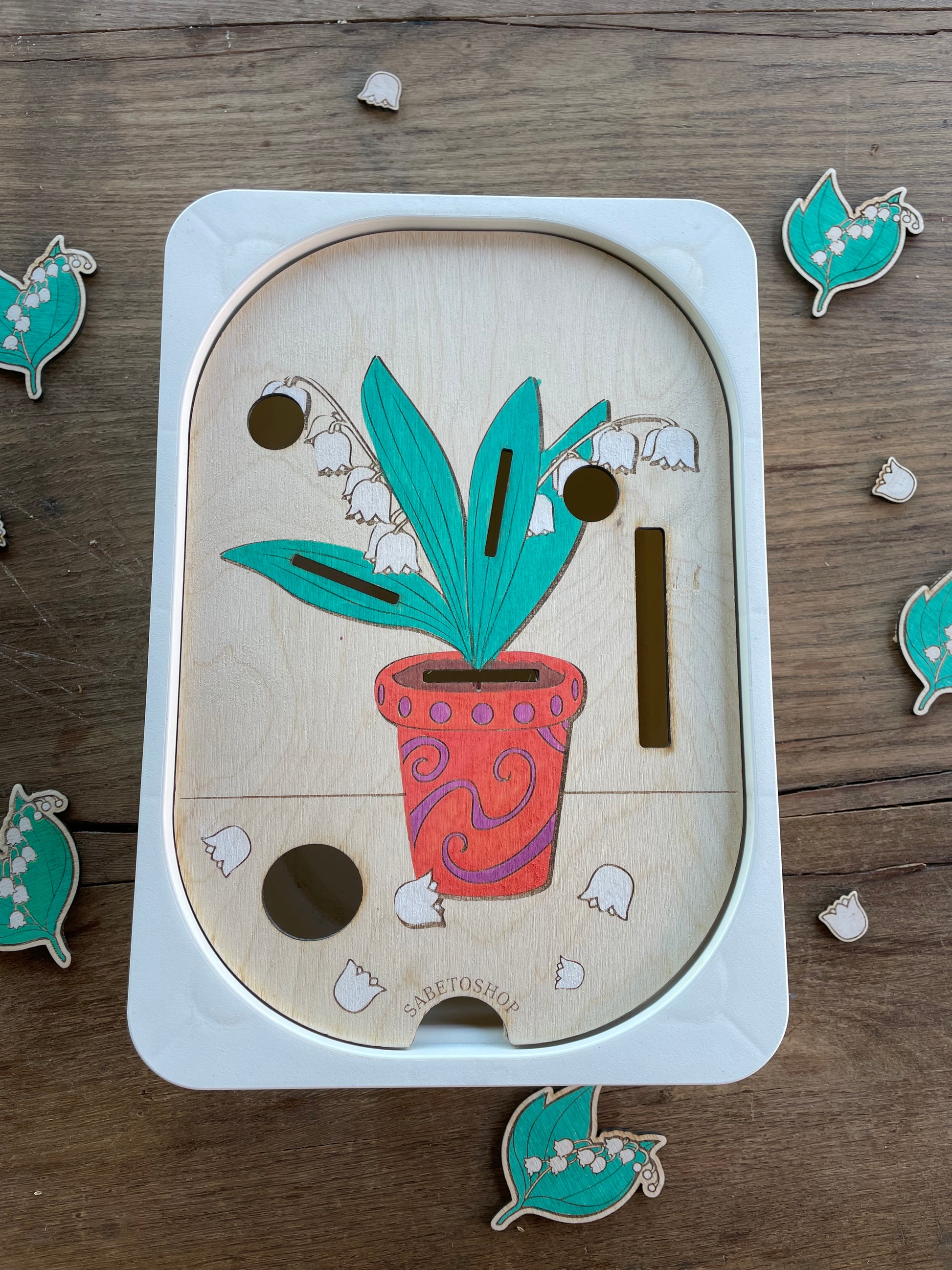 Plaque d’activité en bois adaptée au petit bac Trofast ( 30x20x10 cm ) sur le thème du muguet.