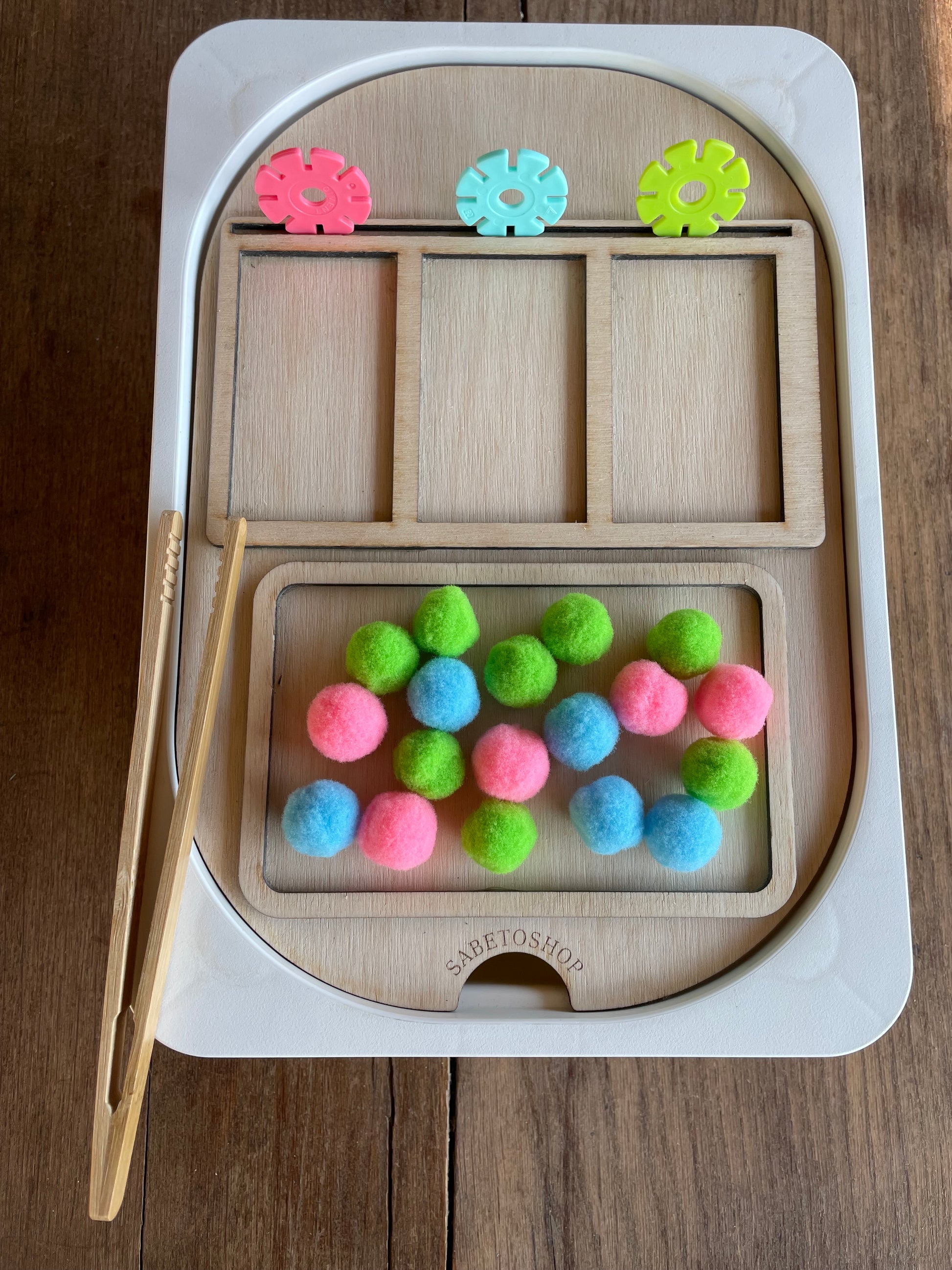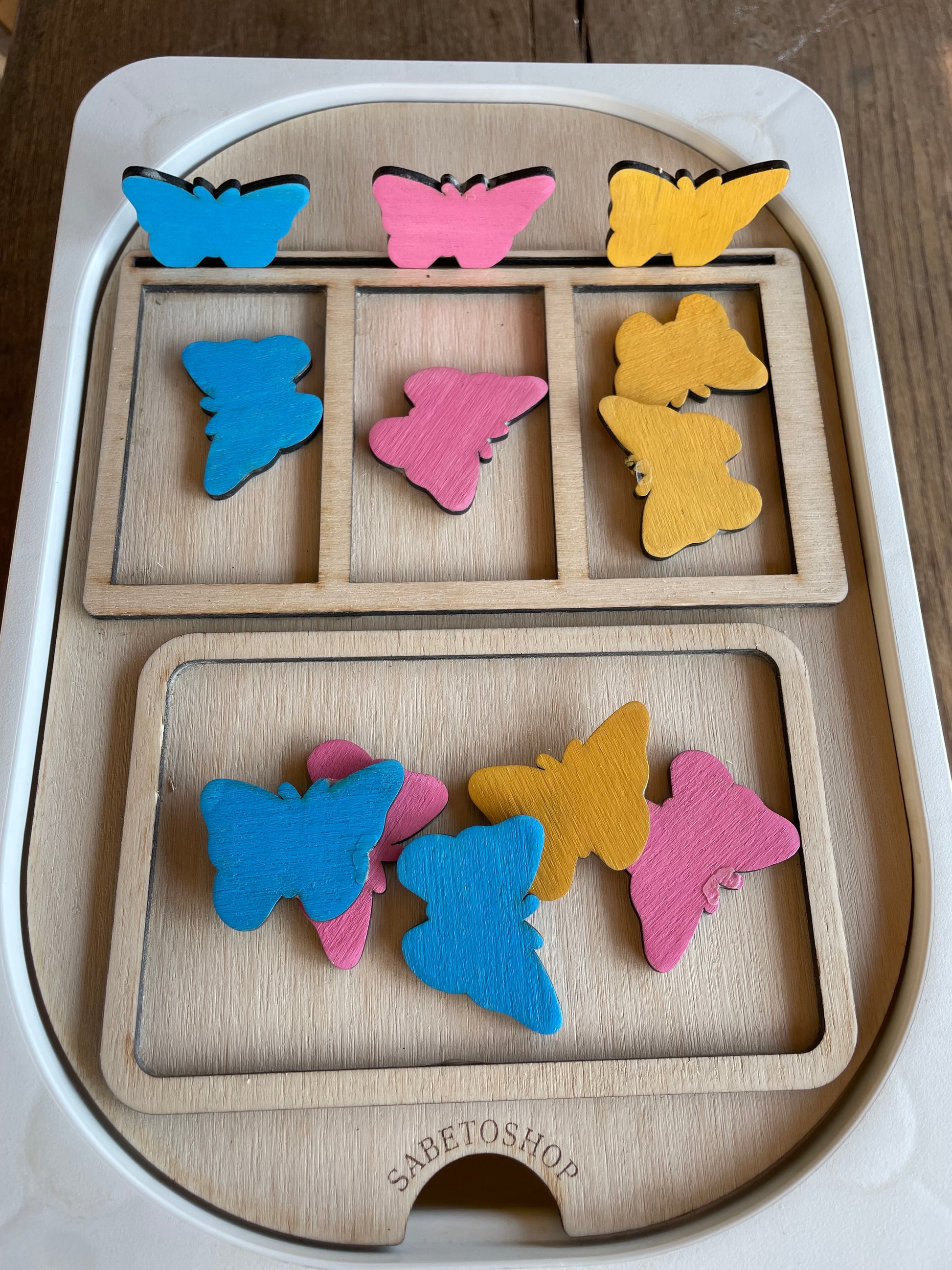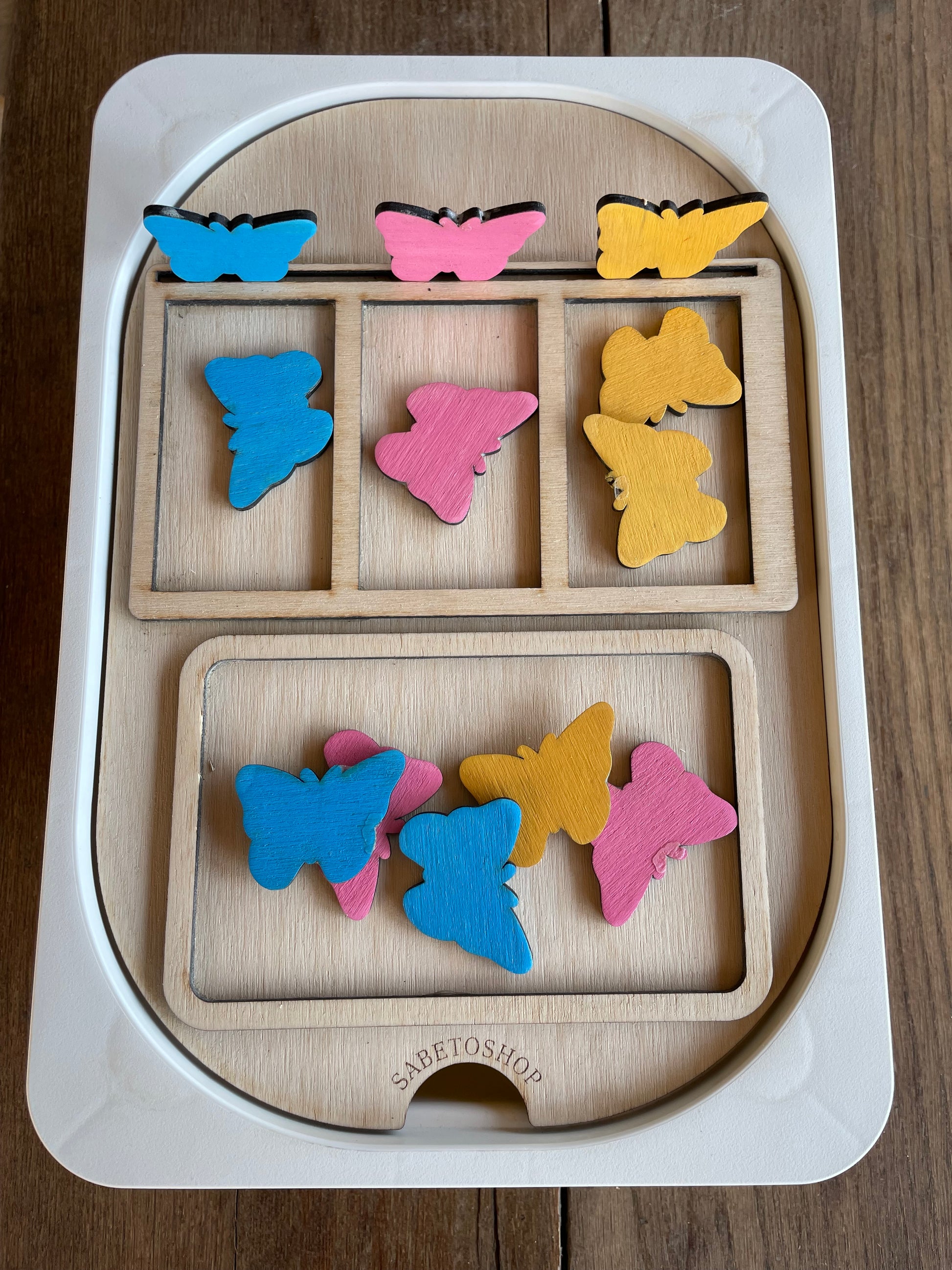 Plaque de tri en bois adaptée au petit bac Trofast (30x20x10 cm ) idéal pour les activités de correspondances des couleurs , des formes ,etc …