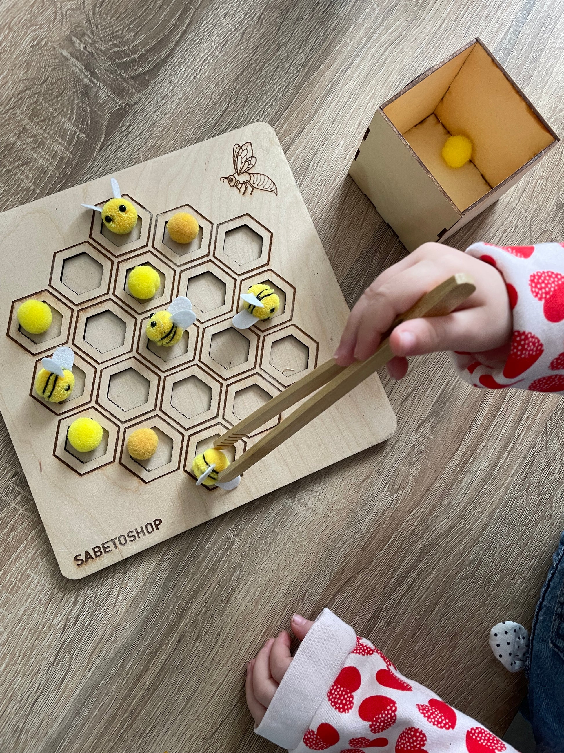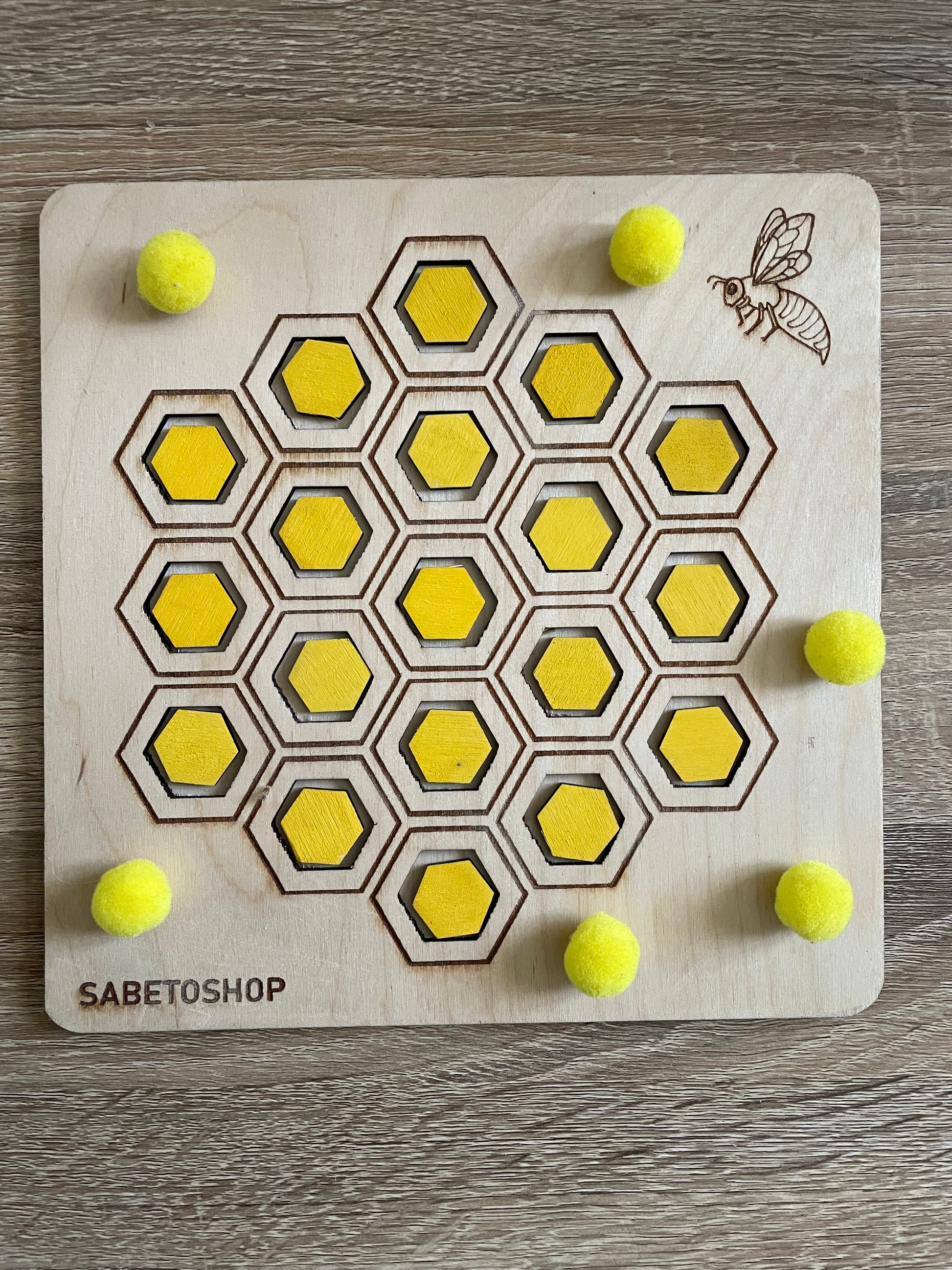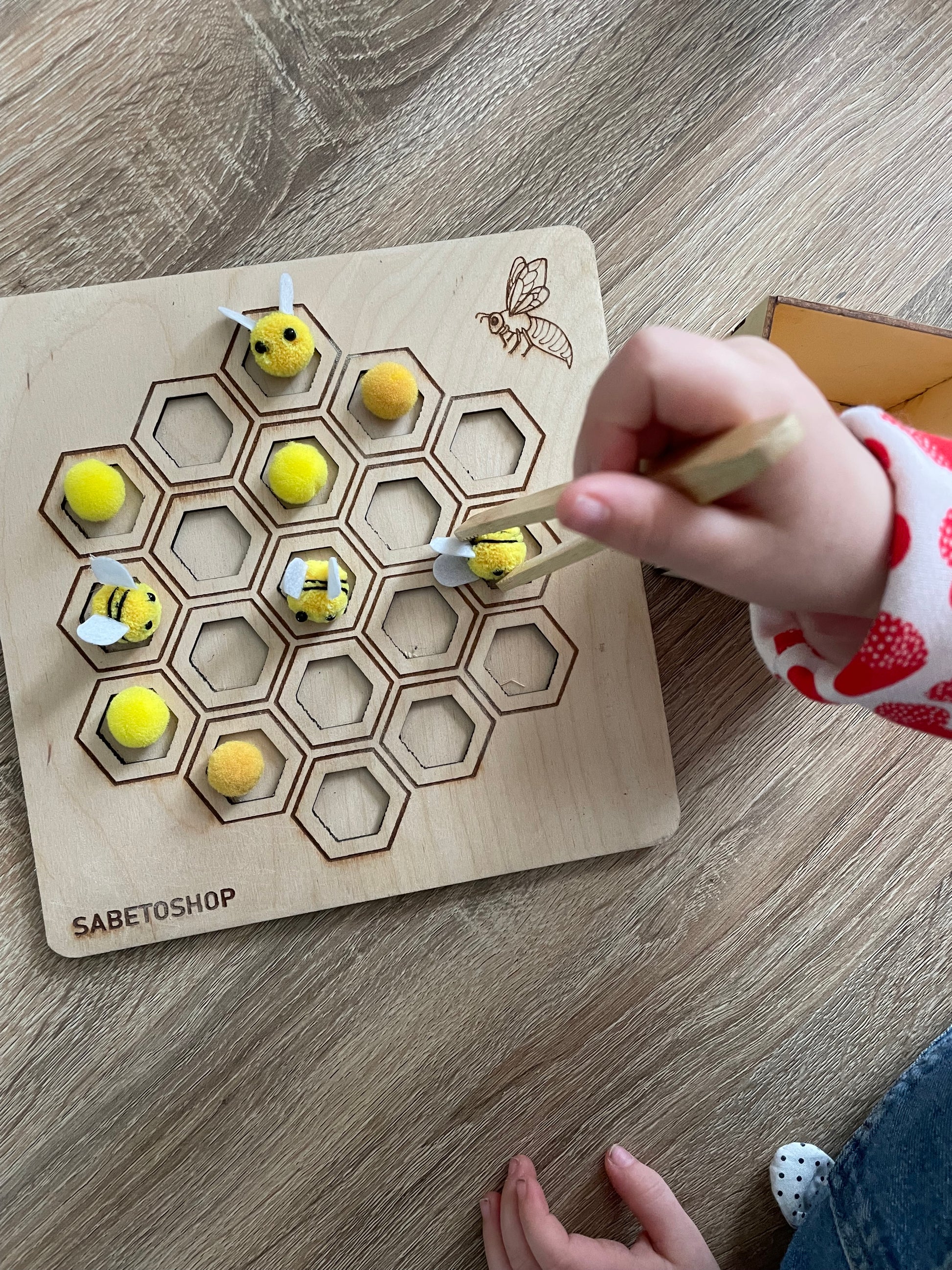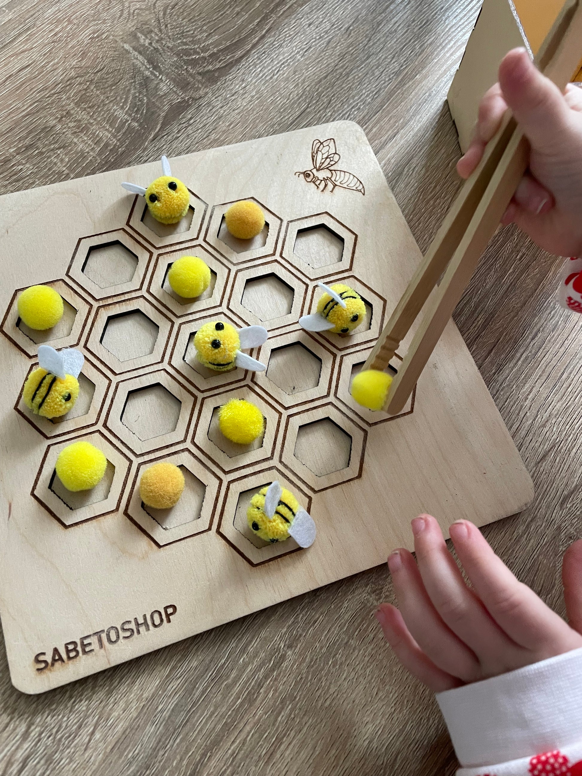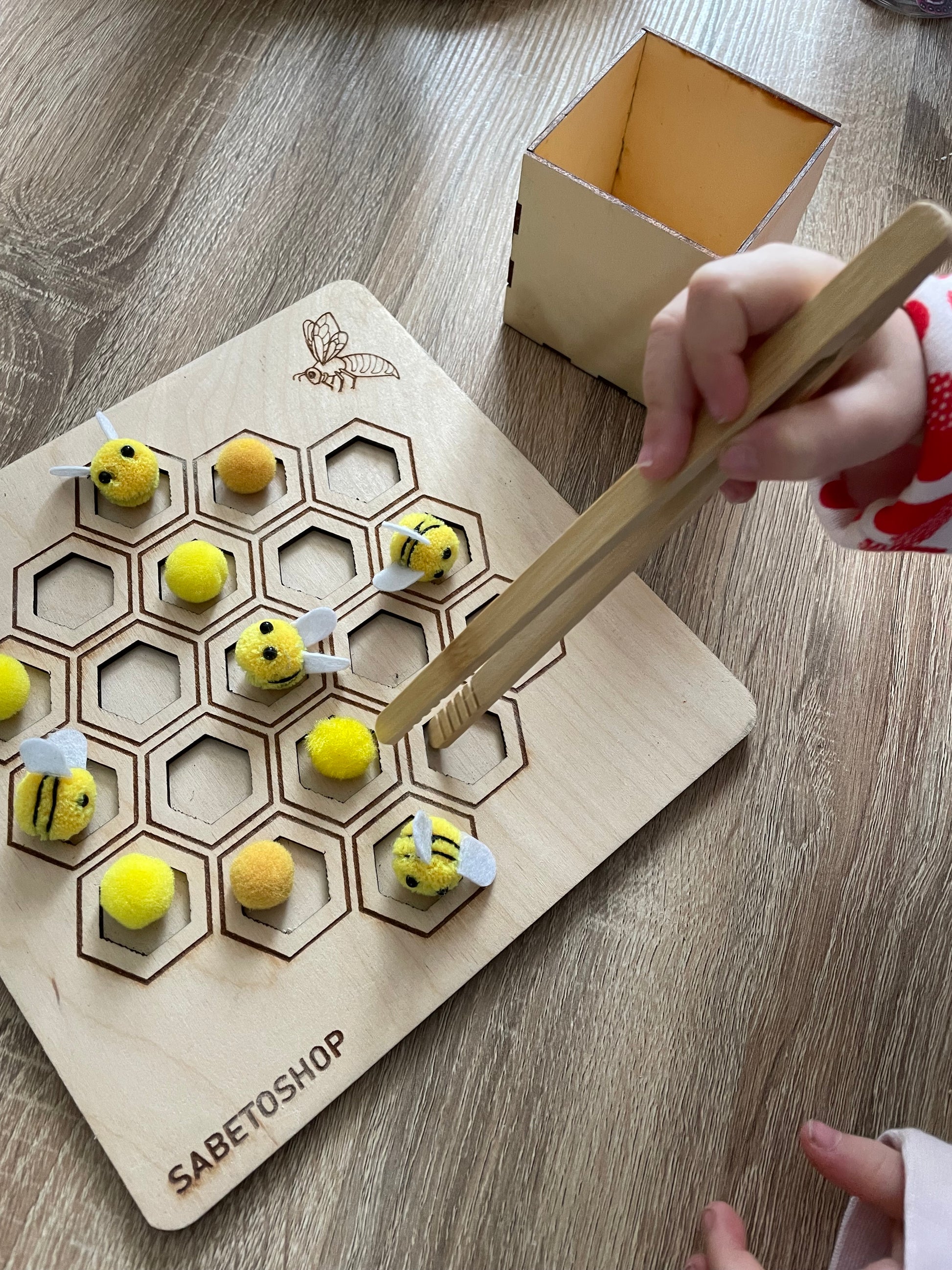 Le plateau de tri en nid d’abeille est en bois , idĂ©al pour le jeu sensoriel et la motricitĂ© fine .